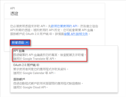 啟用API之後還需搭配API金鑰才能使用推播服務,開啟這個專案的憑證頁面