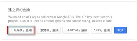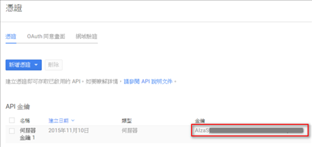 建立完成後即可取得Server API Key,這個金鑰也要記下來,需要填入設定檔中