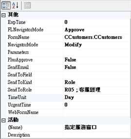 SendToRole:活動的簽核角色,當本活動設定SendToKind為Role之後,就必須在SendToRole中來定義簽核角色。因為我們是要交給客服經理來負責服務窗口的指定,因此我們設定為R05,可以透過此SendToRole右方的下拉選項來選擇角色代號。