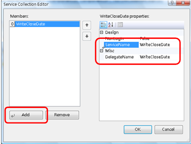 點開ServiceCollection右側按鈕,在Service Collection Editor中,新增一個Service,將ServiceName與DelegateName都設為WriteCloseDate。