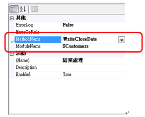 SCustomers,表示CallMethod在那個Server程式中;MethodName設定為WriteCloseDate,表示流程當進入此處時,將執行SCustomers中的WriteCloseDate方法。