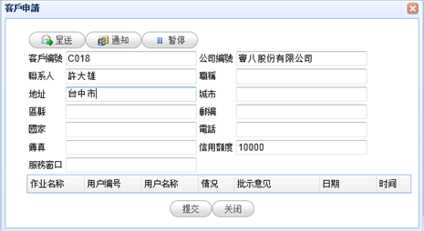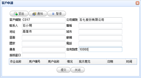 Step4>在「Logon.aspx」中我們以003為User 登入,輸入如下 C017資料,輸入完畢後將資料上呈至005,005登入簽核後,送至007(指定客服窗口),007確認服務窗口為R04後上呈資料,此時系統將此筆資料送給004,004上呈資料後流程進入結案處理,此時系統會根據Server Method中的方法,將LastOrderedDate寫入當前日期。