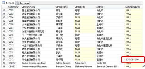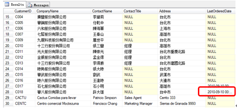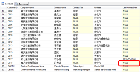 開始下面實例之前確認是否在Customers中存在LastOrderedDate欄位,若不存在請予執行如下SQL語句: