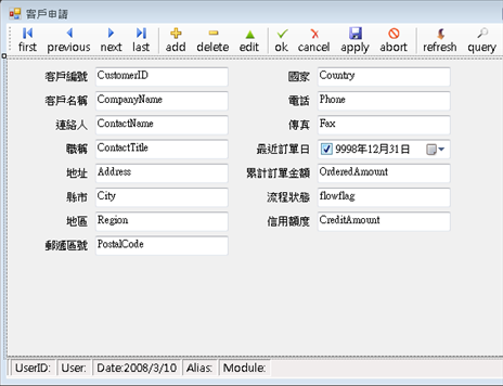 接著設定「FLNavigator.FlowBindingSource」屬性,我們將其設定為ibsCustomers即可,再來可以將此InfoNavigator1中刪除不要用的按鈕,如可以將Print與Export刪除等,到此為止,我們已經設計好一個流程的表單,與一般的EEP2015表單類似。如果是之前用EEP2015所設計好的表單,如果要增加WorkFlow的功能時,也可以用以上的步驟來實現,如果你是新開發的表單就要具有Workflow的功能,則可以在AddIns\Templates\CSingle的目錄中,將原來的Template表單事先貼好FLNavigator取代InfoNavigator元件,將會讓你的設計更為快速與簡便。