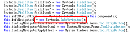 Step6>接著,請打開 CCustomers.designer.cs這個程式,去尋找”Srvtools.InfoNavigator”,應該有2個地方需要更改,如下找到new的地方: