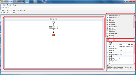 其中,中間的部分為【流程設計區】,右上角的區域【流程活動元件區】,可以將右上角的活動元件(Activity)拖入流程當中,右下角區域為【屬性區】,用來設定各流程活動的屬性內容。