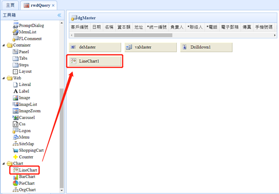 從工具箱裡拖拉一個【LineChart】元件到設計畫面上,如下: