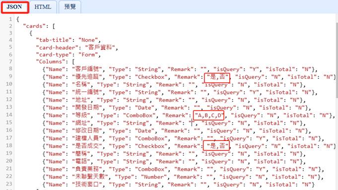 Step3> 多頁簽產生的JSON格式中,其"cards"的內容與之前沒有頁簽有點不同,如下,多了一個"tab-title"屬性,其餘的屬性跟之前一樣。預覽的結果也是,可以透過頁簽來大約了解頁面的布局: