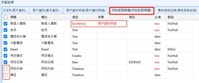 這個例子中,除了主表客戶資料外,還有三個對應的明細表: 客戶資料明細(指聯絡人)/拜訪記錄明細/售前服務紀錄等。