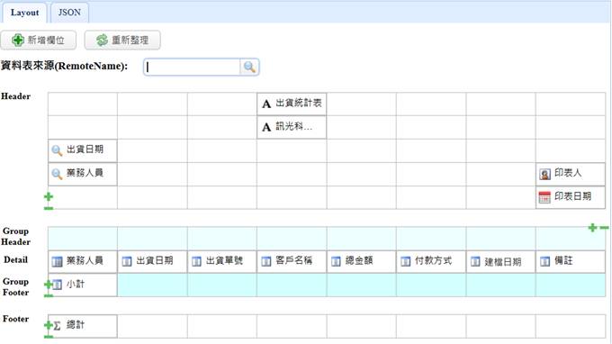 Step6> 接著,同一張報表,我們改成採用GroupHeader/GroupFooter的方式來進行分群,與剛剛的方法有點不同,回到ChatCoder中,用"新增欄位"的方式將"業務人員"拖到GroupHeader中,代表要以此為分群的條件;接著拖入"總金額"到GroupFooter與Footer中,代表要群組小計與最後總計此金額,如下:
