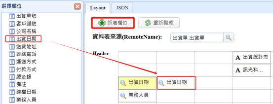 Step3> Header的區域中,因為查詢條件"出貨日期"是一個期間,所以,我們透過"新增欄位"拖拉第二個"出貨日期"到Header當中,如下: