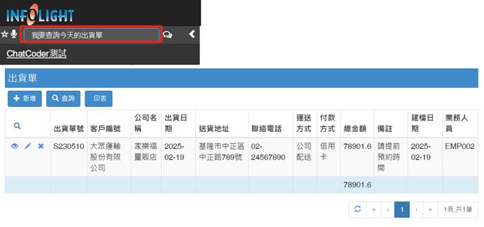 Step3> 接著,可以試著輸入ChatUX的命令,如輸入"我要查詢今天的出貨單"然後按下右邊的圖示開始執行之後,大約3到5秒經過ChatGPT分析之後,就會自動打開"出貨單"並以日期為今天的條件查出對應出貨單資料,如下: