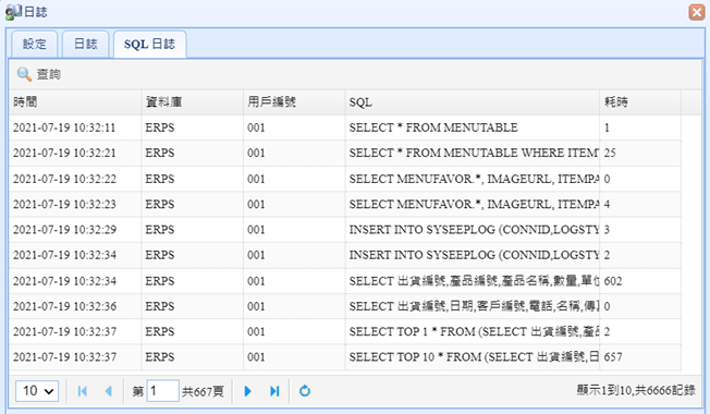 SQL日誌查詢功能,可查詢起訖時間、用戶和資料庫