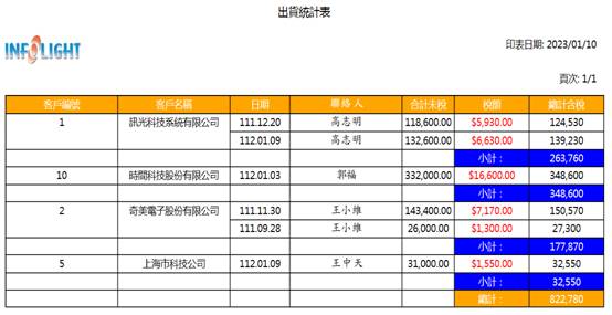 這邊我們將客戶編號、名稱、日期、聯絡人、合計未稅、稅額和總計含稅五個欄位依序拖至[報表排版]的第一列。