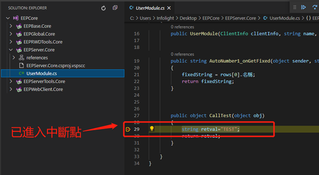 回到VS Code,打開EEPServer.Core下的UserModule.cs,並在要偵錯的原始碼前下斷點。